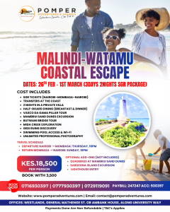 If you’ve been dreaming of escaping the city for the golden sands of the North Coast, this is your sign! Join us from 26th February to 1st March for a 3-day, 2-night SGR adventure that perfectly blends relaxation with iconic coastal exploration. From the mysterious echoes of the Gedi Ruins to the stunning golden landscapes of the Mambrui Sand Dunes, this Malindi-Watamu escape is designed for those who want to experience the true essence of Kenya’s coastal beauty.