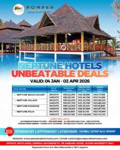 Experience the best of the Kenyan coast with Pomper Adventures & Safaris. We are offering exclusive, limited-time travel packages to the renowned Neptune Hotels chain. Whether you are looking for a quick weekend escape or an extended luxury vacation, our Neptune Hotel deals are designed to provide maximum value and relaxation.